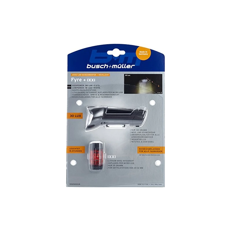 Le pack d?éclairage du phare avant FYRE + le feu arrière IXXI 383 de la marque BUSCH & MULLER est conçu pour voir et être vu dans des situations de visibilité difficile.