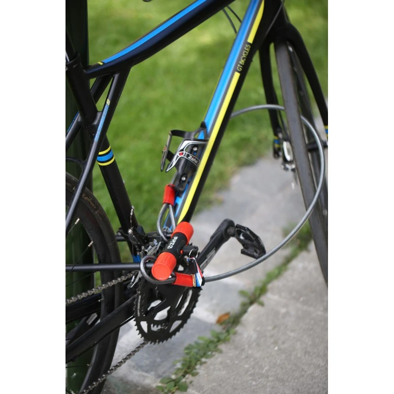 Cet antivol U allie une anse en acier très solide avec un câble qui permettra de sécuriser votre roue avant ou votre selle en même temps.